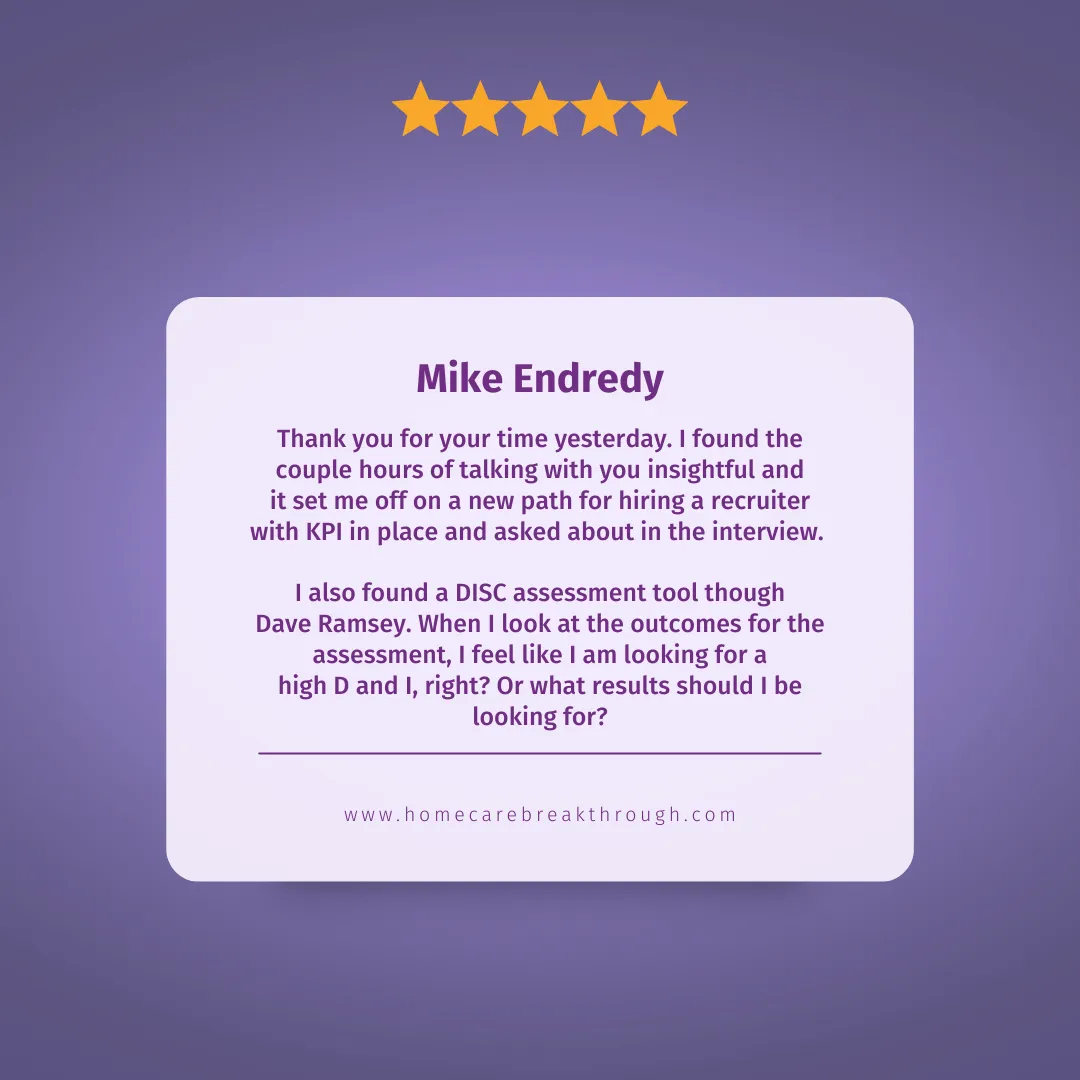 In this process…you are establishing KPIs inside of your business with team members so everyone knows WHAT they should be doing and how they will be held accountable (with a heavy focus on the key drivers in home care..(sales and recruiting)…Do this and watch as your productivity goes up almost instantaneously. Listen to the interview on how this piece helped the Parrot’s